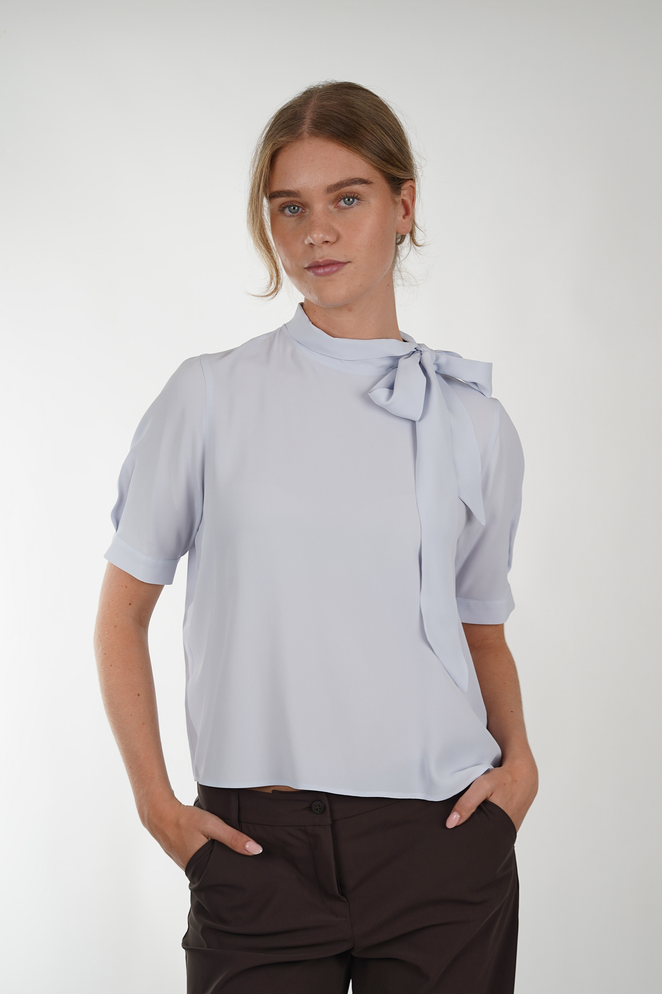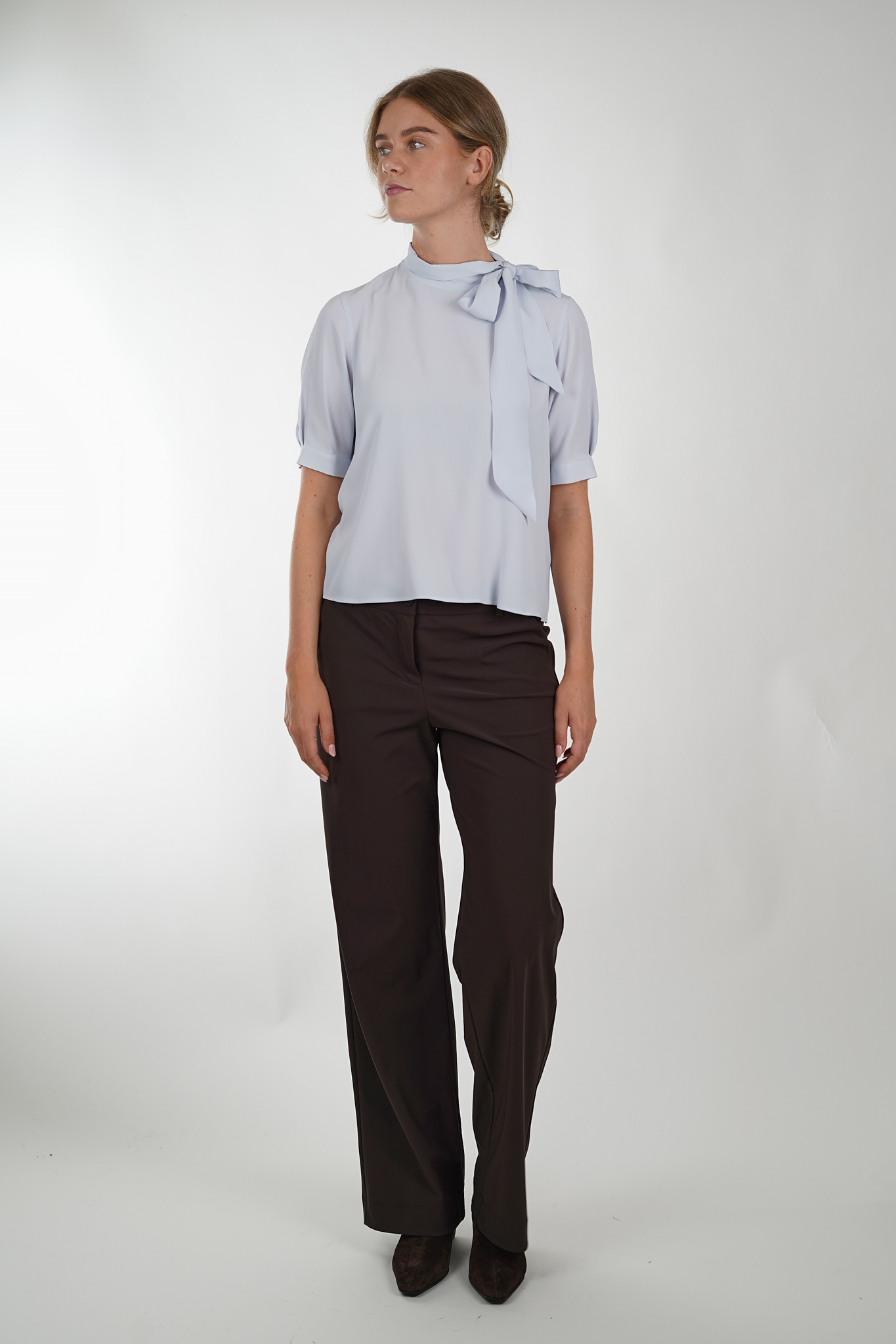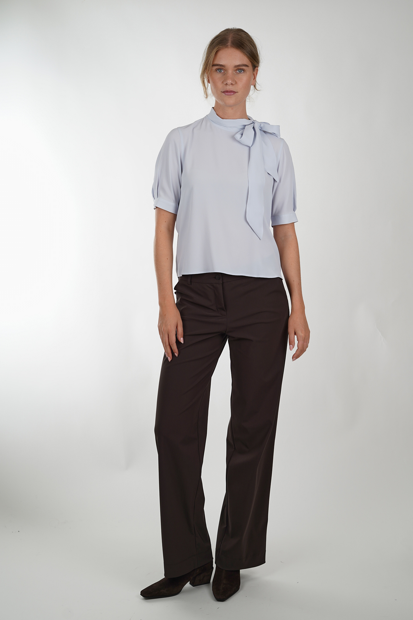 Soepel vallende blouse met pof mouwtjes van Riani. Het model heeft een ronde hals met knoopsluiting en strik.
