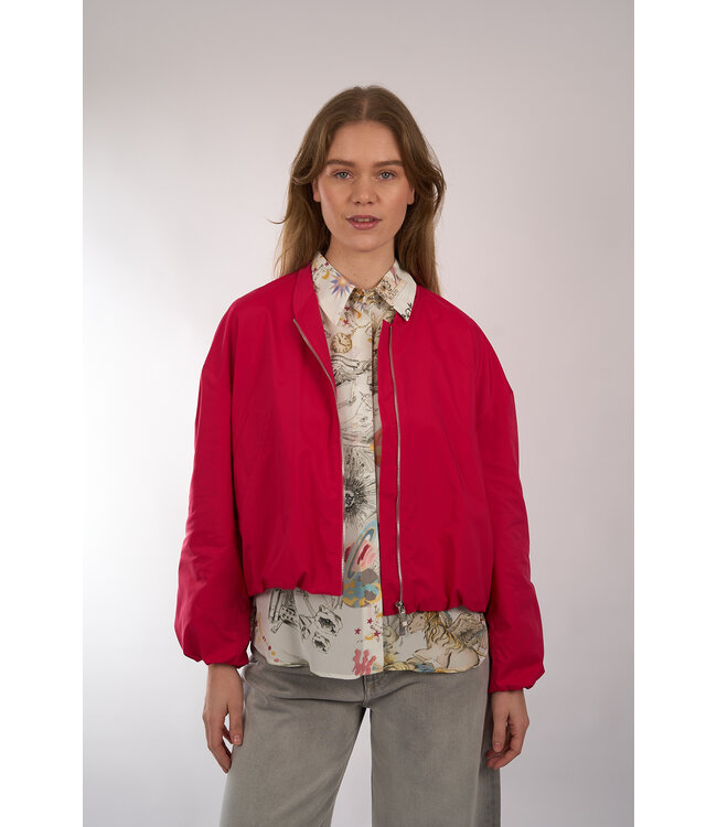 Bomberjack van Riani met een opstaand kraagje, ritssluiting en elastische zoom met trekkoord. Het jack is gevoerd, voorzien van steekzakken en heeft een normale pasvorm.