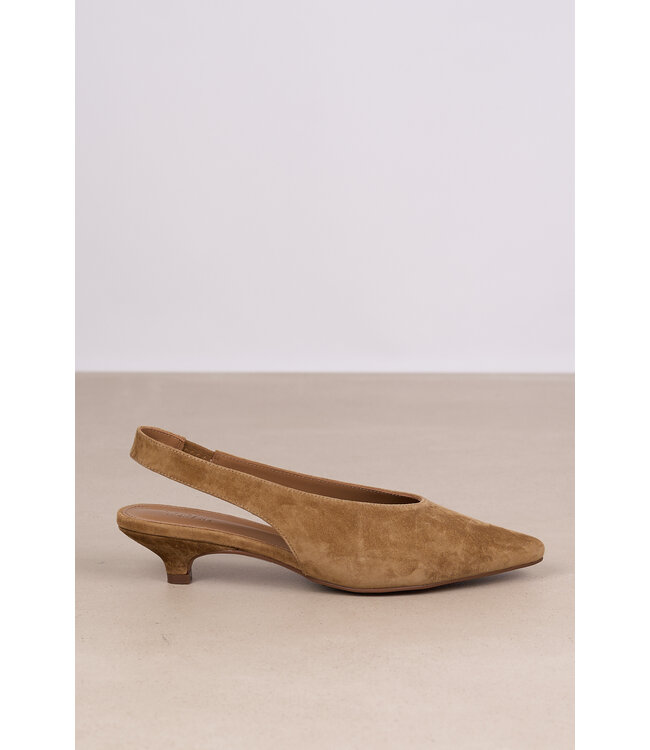 Slingback schoen van Toral combineert elegant camel suède met een verfijnde spitse neus. De schoen is volledig leergevoerd en heeft een leren zool. Een elastische hielband en lage hak bieden optimaal comfort voor een gepolijste, vrouwelijke look.