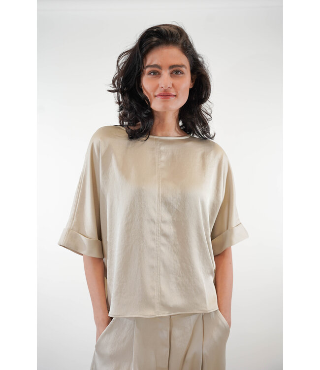 Deze satijnen top van ZENGGI heeft een losvallende pasvorm met op de rug een plooi. Het model heeft een wijde halslijn en een afgeronde zoom aan de voorkant bij de twee splitjes. De wijde korte mouwen hebben een omgeslagen zoom. Lees meer.